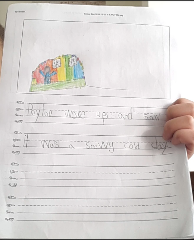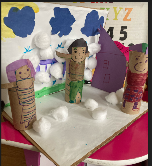 Then, we launched our final product! In years past, Kindergarten students have written their own creative weather story, inspired by Ezra Jack Keats’ The Snowy Day. This year, we took it up a notch by having students create their own puppet shows to go along with their stories! We started by reading The Snowy Day as a mentor text to learn about the components of a good story. Then, students drew out the different elements of their story (thinking of their own original characters and setting, type of weather, and a way their character could help someone in their community). Students took these drawings to create a puppet and background in Art Class with Mrs. Brott-Holtzmann. Then, we wrote sentences to go along with each page and event. After our stories were complete, students practiced using their puppets to act out the story and even added their own dialogue! Since many of our students are learning remotely this year, students filmed their puppet shows for everyone to see later!
